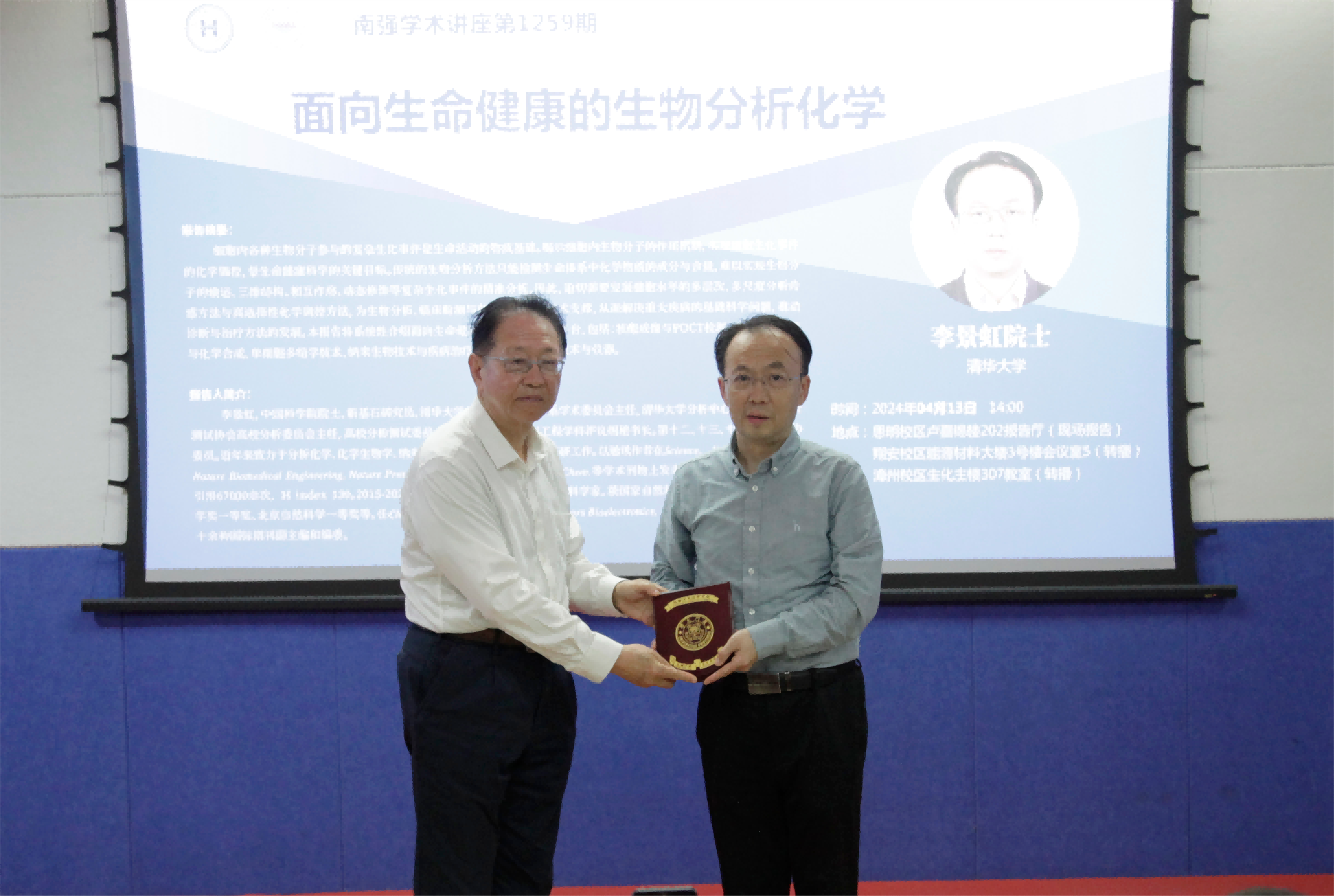 2024年4月13日,清华大学李景虹院士应邀访问我院,并在卢嘉锡楼202报告厅为师生带来“南强学术讲座”的第1259期报告。李院士报告题目为“面向生命健康的生物分析化学”,讲座由任斌院长主持,郑兰荪院士为李景虹院士颁发了“南强学术讲座”荣誉铭牌。