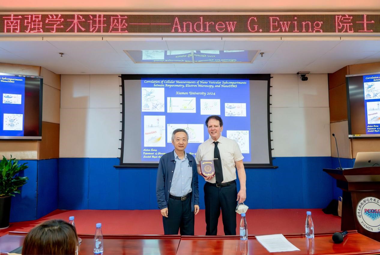 2024年4月15日,应学院邀请,瑞典皇家科学院院士、哥德堡皇家艺术与科学院院士Andrew G. Ewing教授访问厦门大学,并做客厦门大学“南强学术讲座”,在卢嘉锡楼202报告厅为师生带来题为“Correlation of Cellular Measurements of Partial Exocytosis and Nano Vesicular Subcompartments between Amperometry and NanoSIMS”的精彩讲座。田中群院士主持讲座并为Andrew G. Ewing教授颁发“南强学术讲座”荣誉铭牌。