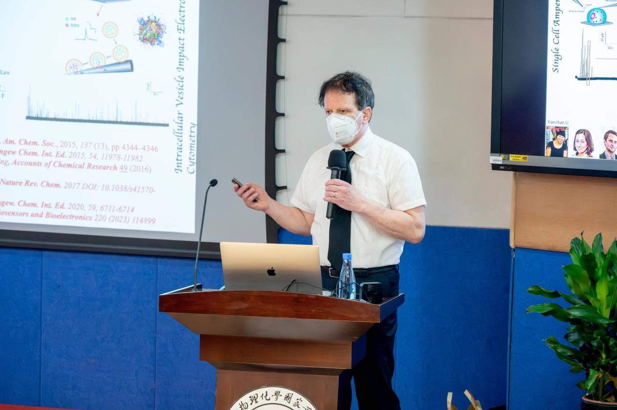在本次报告中,Andrew G. Ewing教授将安培法与IVIEC(Intracellular Vesicle Impact Electrochemical Cytometry, 细胞内囊泡碰撞电化学计数法)等新型电化学技术结合,揭示细胞囊泡的部分释放行为。他们进一步结合NanoSIMS成像、TEM和稳定同位素标记等方法在纳米级别上对囊泡中的内容物进行定量分析,发现这些方法在不同囊泡结构中测到的儿茶酚胺的相对含量与电化学检测结果高度一致,证明了这些方法的可靠性。他们联合电化学测量和扫描电镜成像展示了应激颗粒可以诱导囊泡的同型融合,发现了胞吐新机制。这些方法推动了对细胞囊泡胞吐过程的深入研究和细胞内信号传递和药物传输机制的理解。在提问互动环节,现场师生与Andrew G. Ewing教授进行热烈的交流探讨。