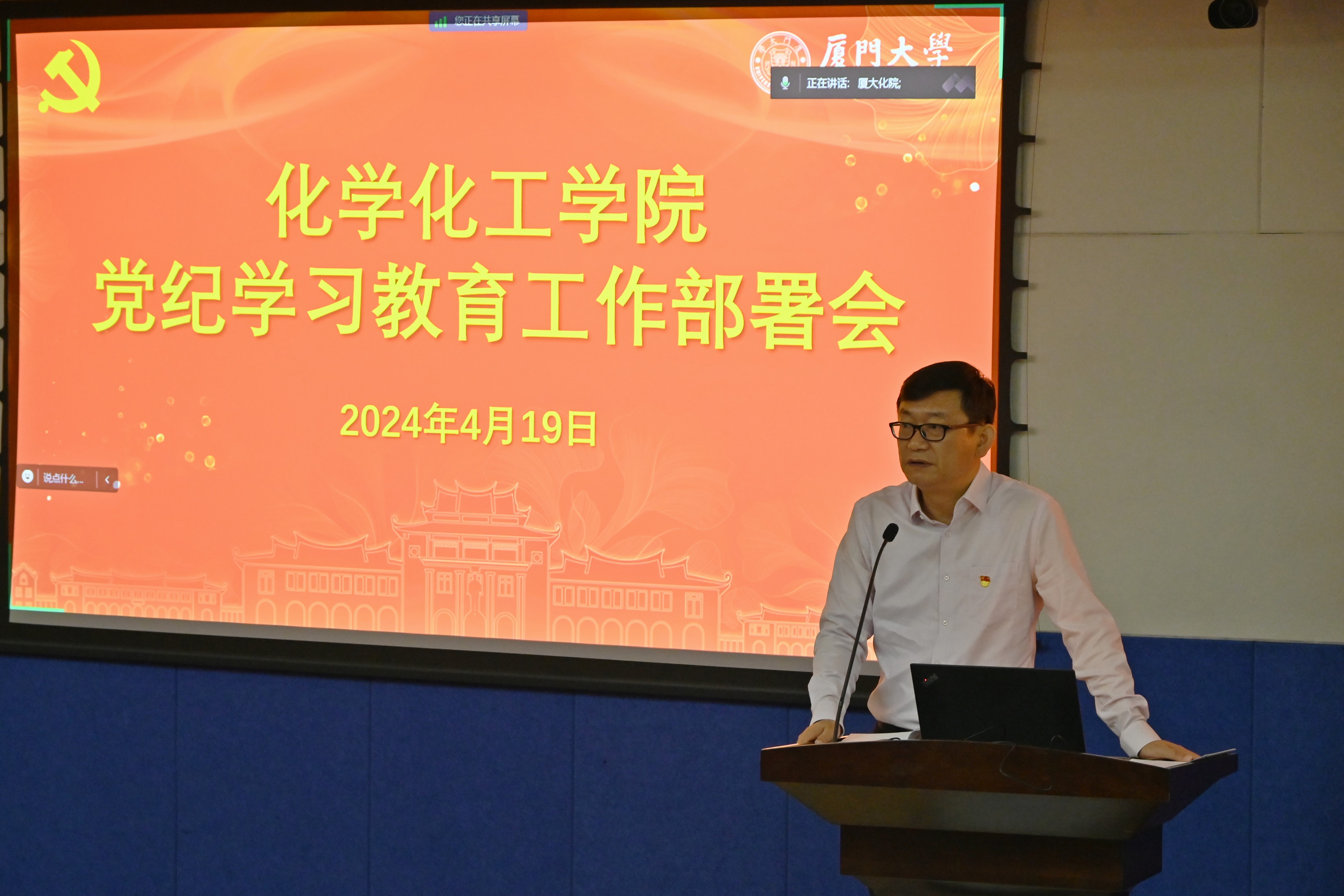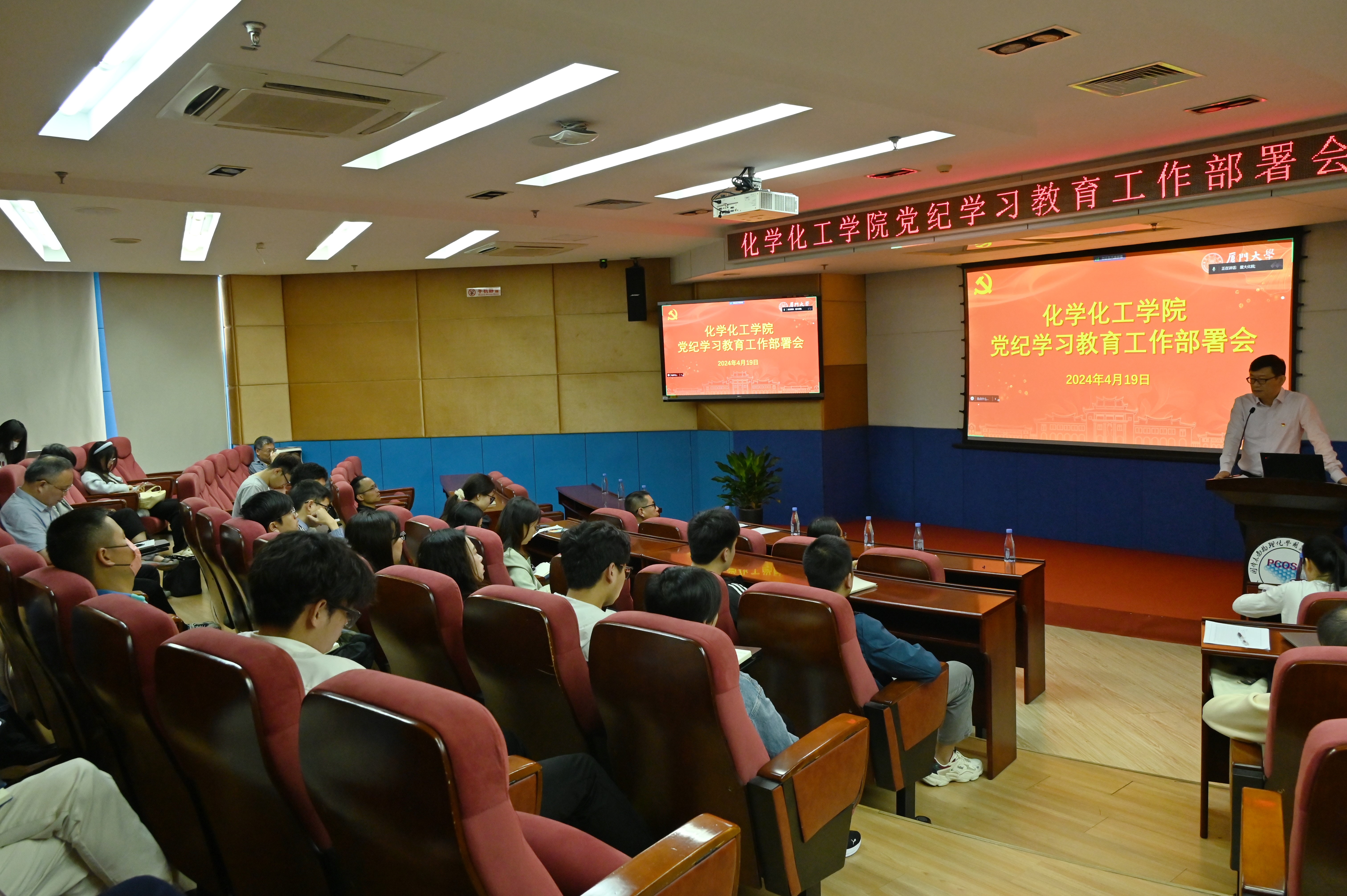 4月19日上午,化学化工学院党委在卢嘉锡楼202报告厅召开党纪学习教育部署会,传达学习习近平总书记关于党纪学习教育的重要讲话和重要指示精神,贯彻落实学校党委党纪学习教育部署会精神,并就学院党委开展党纪学习教育工作作动员部署。学院党委书记宋毅,党委副书记、纪委书记刘俊杰,党委副书记聂鑫,师生党支部书记、支委,全体辅导员参加会议。会议由刘俊杰主持。