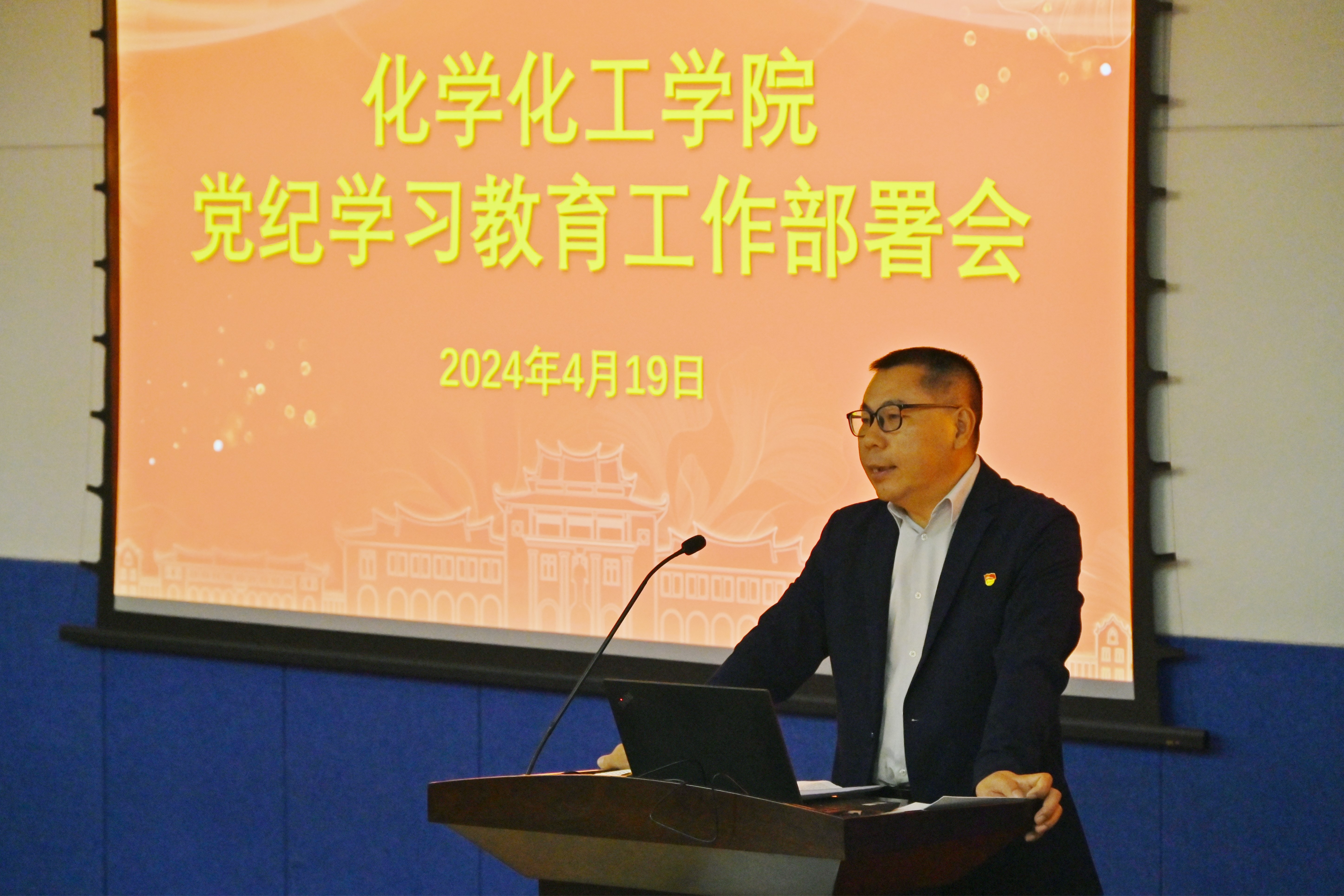 刘俊杰传达了学校党委党纪学习教育部署会精神,并就《化学化工学院党纪学习教育实施方案》作了具体说明。他指出,要坚决贯彻落实党中央、教育部和省委决策部署,结合学校党委要求,按照《化学化工学院党纪学习教育实施方案》开展工作,推动党纪学习教育走深走实。要抓住学习重点,坚持原原本本、逐章逐条、联系实际学好新修订的《中国共产党纪律处分条例》,扎实开展《条例》学习宣传和研究阐释工作。要通过举办理论学习中心组学习会、“先锋讲坛”等开展专题学习,结合“三会一课”“固定党日+”、基层党支部书记讲纪律党课等开展集中学习交流,把党纪学习教育和党性教育、廉洁教育贯通起来,同廉洁文化建设、案例警示教育同步起来,教育引导广大党员、干部自觉接受纪律的约束,主动对标对表,准确掌握党的纪律规矩和党员行为准则,把规矩刻在心上、落在行动上。