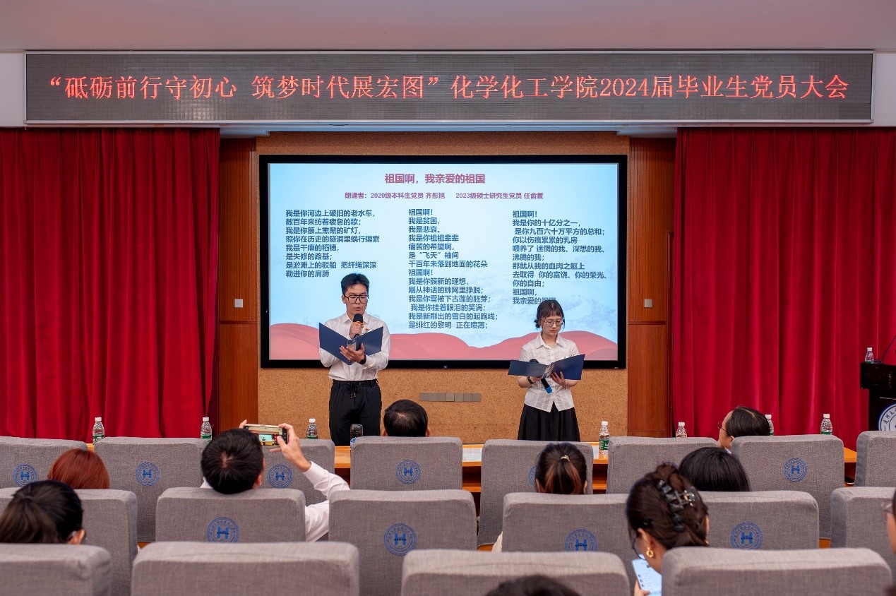会议还为全体6月份入党的毕业班党员同志特别准备了一次别开生面的集体政治生日。党员代表2020级本科生党员齐彤旭、2023级硕士研究生党员任俞萱带来声情并茂的诗朗诵《祖国啊,我亲爱的祖国》。宋毅、聂鑫和林清育为过政治生日的党员同志送上政治生日贺卡。