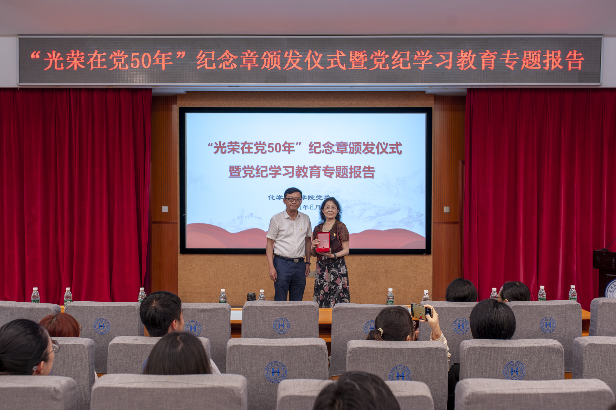 为深入开展党纪学习教育,认真学习领会习近平总书记关于党的纪律建设的重要论述,进一步强化退休教职工党支部组织建设,丰富退休党员的组织生活, 6月19日下午, 化学化工学院党委在化学报告厅举办“光荣在党50年”纪念章颁发仪式暨离退休教职工党支部组织生活。学院党委书记宋毅,党委副书记、纪委书记刘俊杰,党委副书记聂鑫,学院党委委员,教工党支部书记、支委,全体退休教职工党员以及其他师生党员代表参加学习。会议由刘俊杰主持。