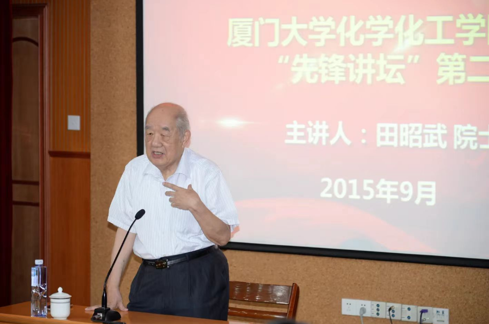 田昭武先生培养了7名博士后、39名博士、32名硕士,其中有5名成长为中外院士。他潜心研究、笔耕不辍,编著的《电化学研究方法》成为广大电化学学子的重要教材。他致力于实现中国电化学学科的“春满园”,自1977年起率先并多次举办全国性电化学培训班和研讨班,为我国培养了一大批电化学学科带头人和科研教学骨干;积极搭建电化学国际交流平台,1995年担任大会主席组织了第一次在我国举办的国际电化学学会年会,500多位国际学者参与盛会,对推动中国电化学学科的发展和奠定在国际上的地位和影响做出了杰出贡献。他捐资设立厦门大学“田昭武学科交叉奖”“清寒奖学金”等多个奖教奖学金。