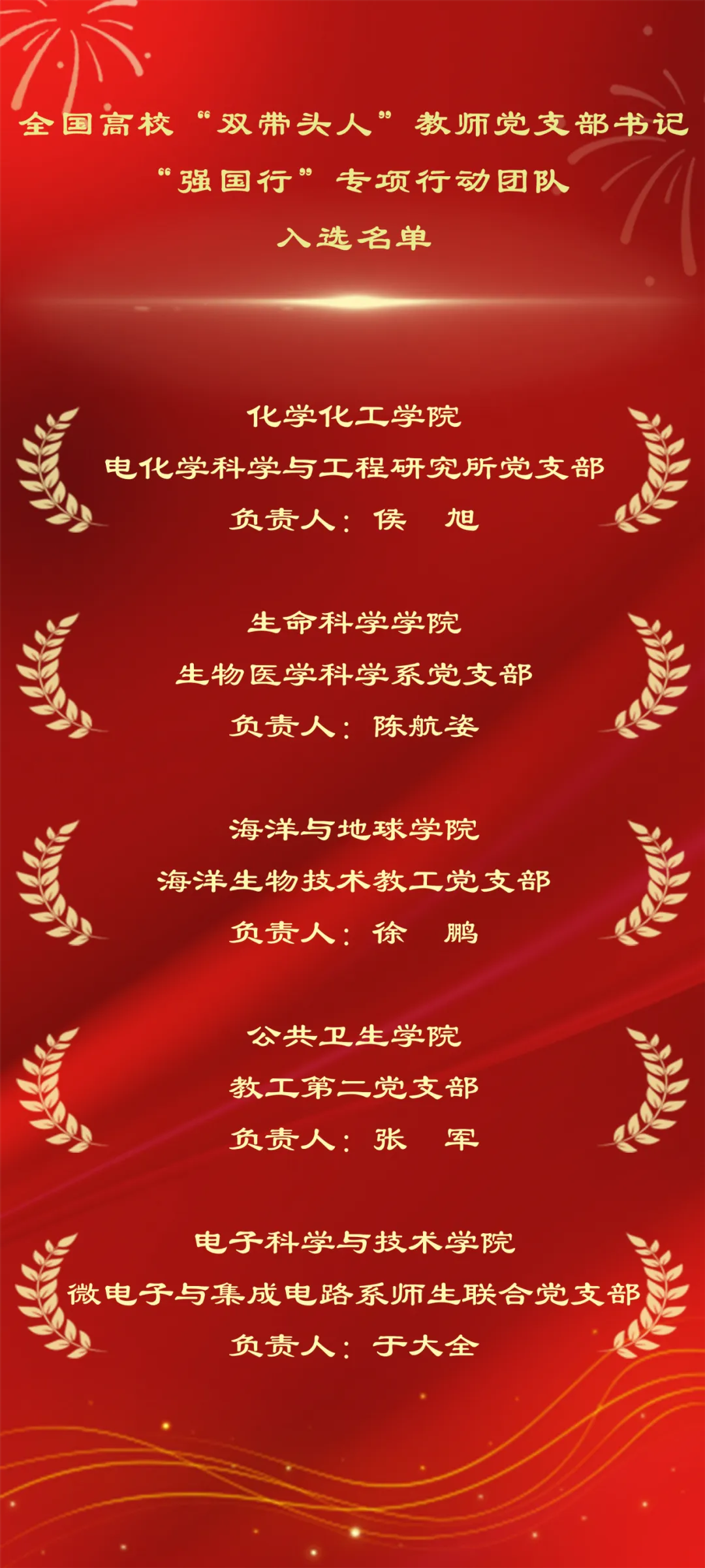 近日,教育部公布了全国高校“双带头人”教师党支部书记“强国行”专项行动团队名单。我校5个党支部成功入选。我院电化学科学与工程研究所党支部位列其中。
