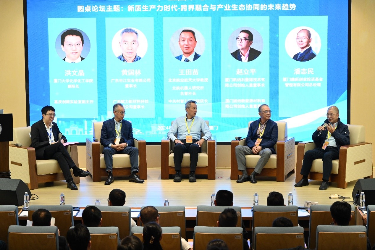圆桌论坛环节由厦门大学化学化工学院副院长、嘉庚创新实验室副主任洪文晶主持。北京航空航天大学教授、北航机器人研究所名誉所长、中关村智友研究院院长王田苗教授,厦门凯纳石墨烯技术股份有限公司、厦门固纳新能源材料股份有限公司创始人兼董事长赵立平校友,广东丰江实业有限公司、广西赋力新材料科技有限公司董事长黄国林校友,厦门鼎新创业投资基金管理有限公司总经理潘志民校友结合自身的创新创业经历和丰富的业界经验,共同探讨新质生产力时代下跨界融合与产业生态协同的未来趋势。