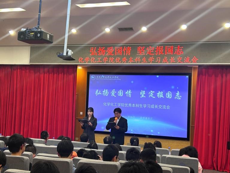 为培养具有爱国情怀和报国志向的拔尖创新人才,引导学生科学做好职业规划,提升资助育人实效,11月29日晚,化学化工学院以“弘扬爱国情,坚定报国志”为主题,举办优秀本科生学习成长交流会。学生处副处长刘俊英、化学化工学院副院长陈嘉嘉、党委副书记杜超、化学工程与生物工程系副主任黄加乐、化学系教授匡勤、资助育人教工代表与2024级全体本科生和其他年级代表共同参与交流会。