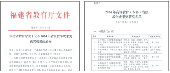 据悉,福建省教学成果奖包括基础教育、职业教育、高等教育(本科)、高等教育(研究生)4个大类,每2年评选一次,奖励等级分为特等奖、一等奖、二等奖3个等级。