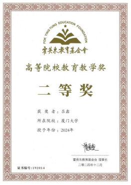 吕鑫教授曾获宝钢优秀教师奖(2017年)、教育部拔尖人才培养计划优秀管理人员(2021)、福建省优秀教师(2023)、国家教学成果二等奖1项(2022,排名第一)、福建省教学成果特等奖1项(2022,排名第一)、国家自然科学二等奖2项(2015,2006;均排名第四)等多个重要荣誉或表彰。近五年在《大学化学》发表教学论文4篇;主持申报建设国家级一流本科课程《结构化学》,作为课程组长并长期主讲该课程,主持修订出版教材《结构化学》(第四版);在作为主管教学副院长期间,组织申报获批化学、化工、化学生物学和生物工程四个一流本科专业、拔尖计划2.0基地、强基计划基地和全新本科专业“化学测量学与技术”;积极推进各项教学改革研究和课程建设;作为执行主任成功获批化学专业建设全国虚拟教研室,主持省部级重大教学改革项目2项、参与省部级教改项目3项;组织并多次参加全国性教学类会议汇报和交流,在学界拥有广泛影响。