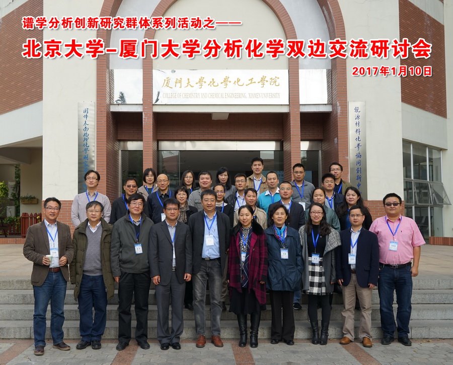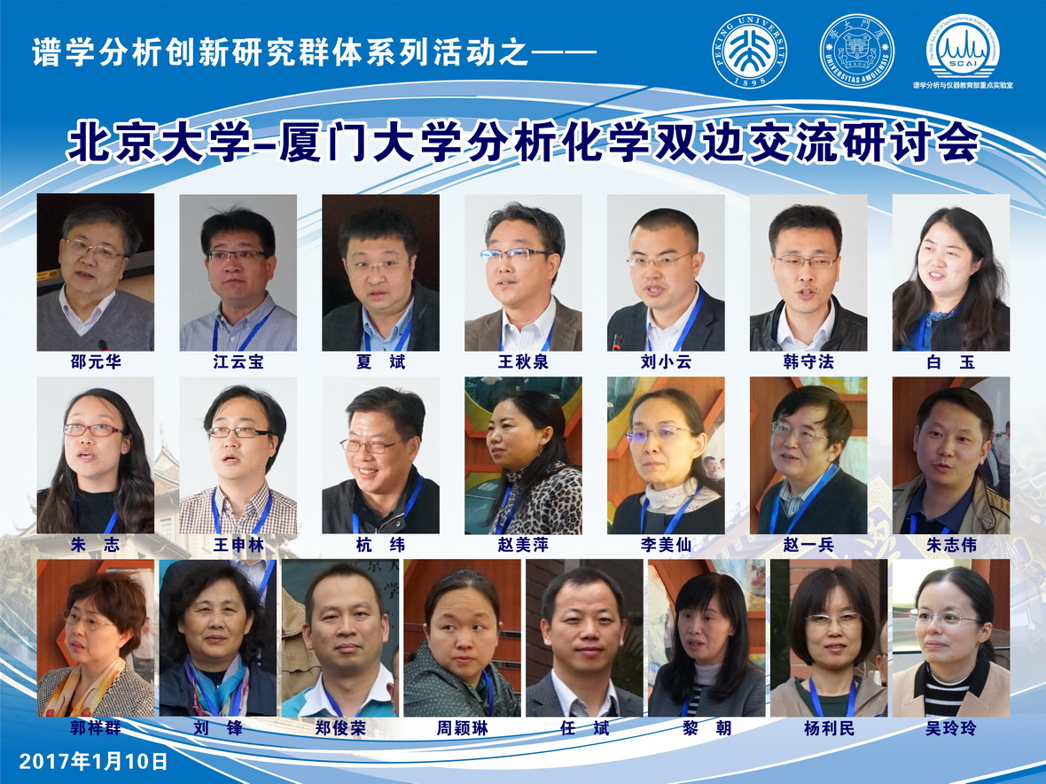 北京大学-厦门大学分析化学双边交流研讨会于1月10日在厦门大学化学化工学院卢嘉锡楼举行。本次研讨会是国家基金“谱学分析”创新研究群体系列会议之一。北京大学化学学院分析化学研究所所长赵美萍教授、邵元华教授、刘锋教授、夏斌教授、刘小云研究员、王申林研究员、郑俊荣研究员、李美仙副教授、白玉副教授、朱志伟副教授、周颖琳副教授,厦门大学化学化工学院分析科学研究所所长王秋泉教授、副所长赵一兵教授、江云宝教授、郭祥群教授、李耀群教授、陈曦教授、任斌教授、杭纬教授、韩守法教授、高锦豪教授、李剑锋教授、吴川六教授、朱志教授等骨干教师和研究生同学参加了会议。学院党委林辉书记、院长江云宝教授、副院长袁友珠教授出席简短开幕式。江云宝院长在开幕式致辞中表示,北京大学与厦门大学分析化学学科学术交流已经历年,双方长期在科研、教学、师生互访交流方面深入开展合作。举办本次研讨会,有助于加强年轻教师的学术交流与自我展示,进一步推动双方分析化学学科的发展与建设。