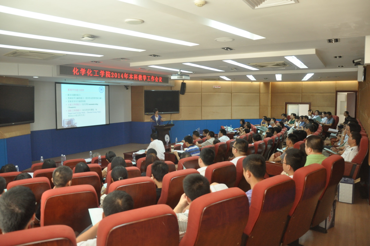 首先,院长江云宝教授致辞。他指出希望在总结发扬学院优良传统的基础上,通过此次会议能够发现问题并提出改进的办法,以进一步提高学院的教学水平。之后,副院长朱亚先教授就学院本科教学、郭祥群教授就化学学科拔尖学生培养试验计划、副院长李军教授就化工专业卓越工程师计划做工作报告。