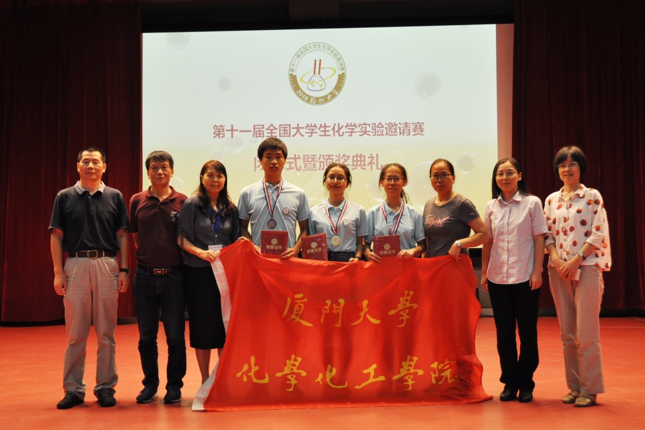 2018年7月6日至9日,第十一届“全国大学生化学实验邀请赛”在福州大学旗山校区举行。厦门大学化学化工学院2015级化学专业的3名同学参加了比赛,经过激烈的角逐,胡芸芸同学荣获一等奖,吴志忠同学和张诗艺同学分别获得三等奖,胡芸芸同学应组委会邀请代表获奖选手在颁奖典礼上进行了发言。