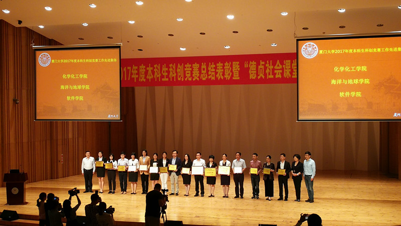 4月4日下午,厦门大学2017年度本科生科创竞赛总结表彰大会在科艺中心音乐厅举行。化学化工学院获得2017年度本科生科创竞赛工作“先进集体”,继2014年后再次获得该项称号;李剑锋教授获得科创竞赛工作“优秀指导教师”,辅导员黄木河获得“先进个人”;6项学业竞赛获奖项目入选“优秀项目”,2篇本科生参与发表的科研论文入选“优秀论文”,1项获年度“最佳大学生创新创业训练计划项目”。