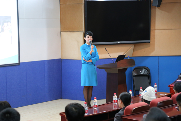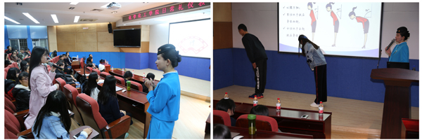 在讲课开始前,张鑫女士问大家,“什么是礼仪?”同学踊跃地提出自己的想法,她对同学的回答进行肯定并给予概括,礼仪是情感的表达,体现在穿着,交往,沟通,情商四个方面。之后她还善意提醒大家请注意坐姿并在她讲课过程中保持这种姿势。
