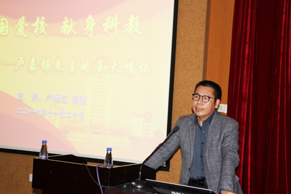 11月20日下午,“化院故事”讲坛之《爱国爱校 献身科学——卢嘉锡先生的厦大情怀》报告会在化学报告厅举行。卢嘉锡先生次子、原北京大学统战部部长卢咸池教授主讲。卢嘉锡先生长子、福建卢嘉锡科学教育基金会理事会副理事长卢嵩岳和长媳李凌,长女、基金会理事会秘书长卢葛覃,厦门大学党委副书记赖虹凯,中科院院士、厦门大学化学化工学院赵玉芬教授,学院党政负责人,2017年度卢嘉锡优秀研究生奖获奖代表以及学院2017级全体本科生出席了报告会。报告会由学院党委副书记刘俊杰主持。