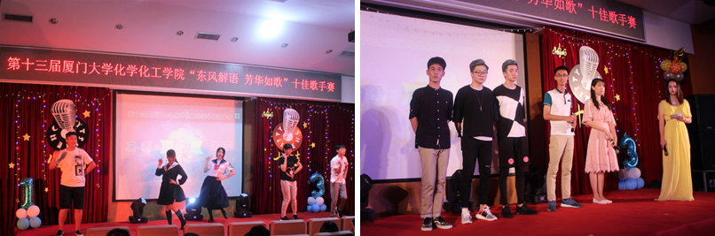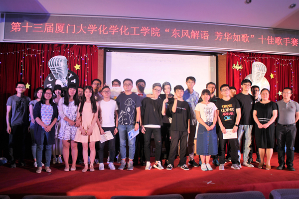 2017年5月20日晚,学院举办的第十三届厦门大学化学化工学院十佳歌手决赛在化学报告厅圆满落幕。当晚,化报厅座无虚席,掌声不断,精彩连连。艺术学院钟啸隆、王凯莹和蒋莉三位同学担任比赛专业评委,院党委书记李芬芬,辅导员卢增夫、林秀娟一同观看了比赛。