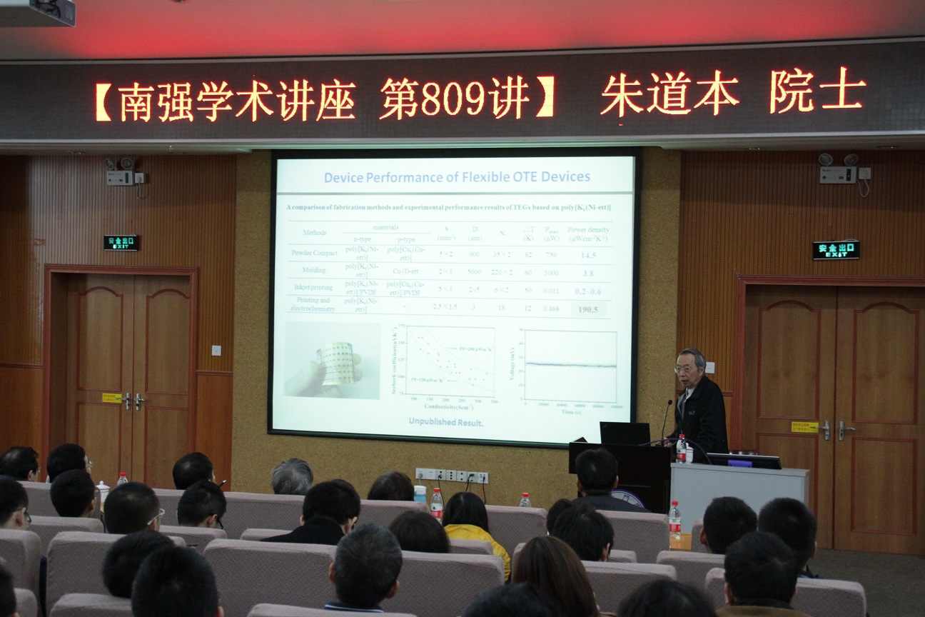 热电材料是一种能将热能和电能相互转换的功能材料,在环境污染和能源危机日益严重的今天,进行新型热电材料的研究具有很强的现实意义。朱道本院士在报告中介绍了热电材料发展机遇和挑战:以碳为基础的有机材料以其价格低廉性、分子多样性以及性能灵活性成为新兴前沿研究方向,其热电转换可提供绿色的能源利用方式,在温差发电、电致制冷等方面具有重要应用前景。朱道本院士结合其研究过程的具体问题,与我们分享其灵活多变的研究方法。例如,在高性能有机热电材料的遴选时,对于不易溶解的粉末材料,朱院士从传统的溶液加工、压片测试等尝试,到复合体系溶解、电化学沉积等具体途径处理,选择了科学的研究办法,给我们解决实际问题以新的思路和启迪。讲座上,朱道本院士给我们展示了不需要外接电源就可以测量温度、压力的e-skin,赵玉芬院士、田中群院士和在座师生也就其应用前景与朱道本院士展开热烈讨论。