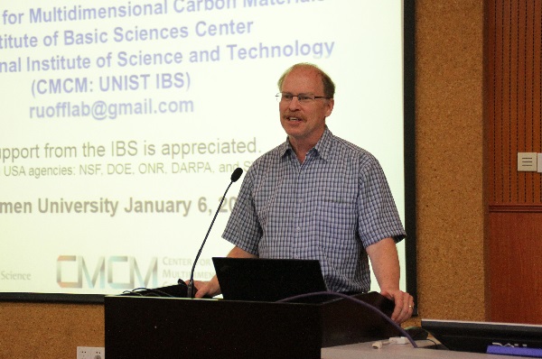2017年1月6日下午,著名石墨烯专家、韩国蔚山国家科学技术研究所(UNIST)Rodney S. Ruoff教授访问我校并以“New Carbon Materials”为题在化学报告厅为我校师生作南强学术讲座暨“2011-iChEM”讲座。化学化工学院郑南峰教授主持了本次讲座,中国科学院院士、化学化工学院孙世刚教授向Ruoff教授颁发了“南强讲座”纪念牌,报告吸引了近三百位分别来自化学化工学院、材料学院、物理机电学院的师生到场聆听。