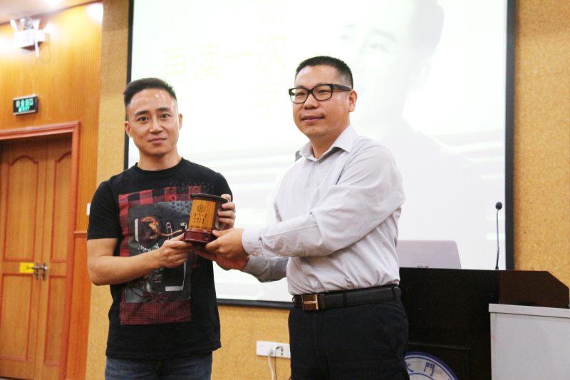 最后,院党委副书记刘俊杰老师对报告进行总结,并代表学院向张浩送上了精心准备的礼物——印有厦大标志的精美笔筒。