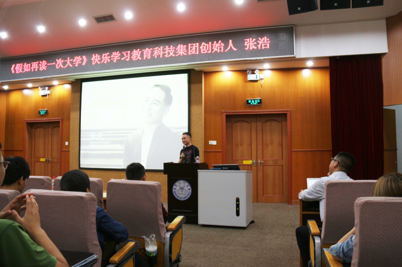 10月30日晚,化学化工学院有幸邀请到快乐学习教育科技集团创始人、享学网络科技创始人张浩为学院学生作“假如再读一次大学”为主题的报告。院关工委常务副主任潘宝柱老师、辅导员杨家麒老师、郭江淮老师以及学院近300名学生参加了报告会。报告由学院党委副书记刘俊杰老师主持。