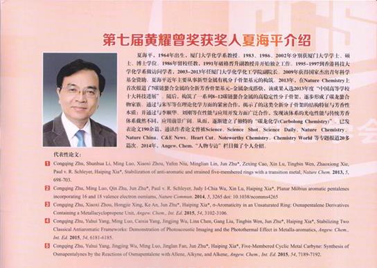 中国化学会第七届“黄耀曾金属有机化学”颁奖仪式于10月31日在杭州召开的第十九届金属有机化学学术会议上举行。厦门大学夏海平教授和美国Scripps研究所余金权教授荣获本届“黄耀曾金属有机化学奖”。两位学者分别发表了获奖感言,并作了精彩的学术报告。夏海平教授报告的题目是:碳龙化学-一系列全新的芳香分子骨架基元。