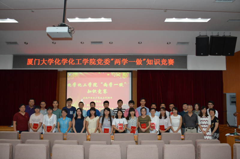 7月20日下午,化学化工学院党委在化学报告厅举办的“学党章党规、知党史党情”党章党史知识竞赛圆满落下帷幕。竞赛共有学院15个师生党支部, 27名师生党员联合报名参赛。这是学院党委为了深入贯彻学习领会习近平总书记系列重要讲话精神,浓厚学习教育氛围,扎实推进学院“两学一做”学习教育而开展的一项活动,也是学院党委全面落实校党委关于“两学一做”学习教育的部署安排一项重要举措。校党委组织部、统战部、学生处以及学院党委负责人出席了本次比赛。