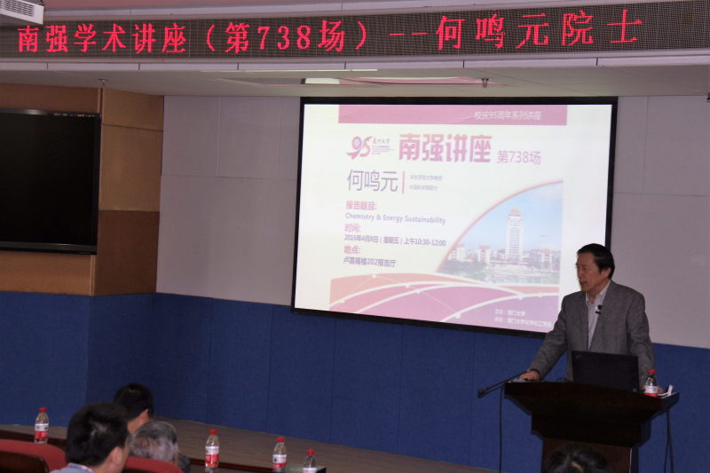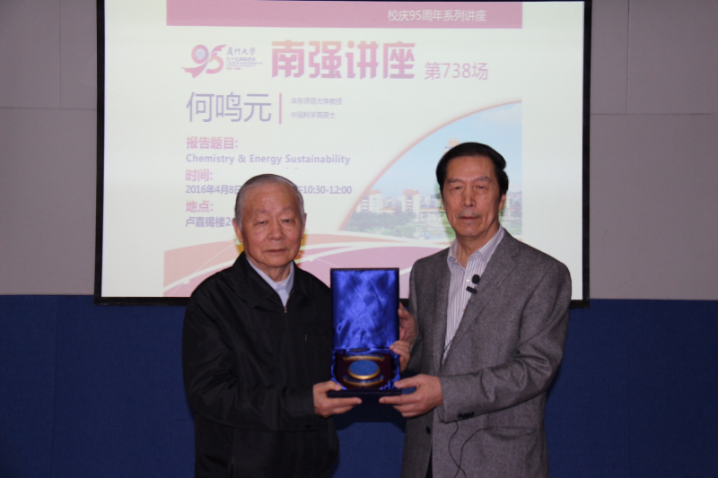 4月8日上午,中科院院士、华东师范大学何鸣元教授来访我校,应邀做南强讲座(第738讲),在卢嘉锡楼202报告厅,为学院师生带来题目为“Chemistry & Energy Sustainability”的精彩报告。报告由化学化工学院院长江云宝教授主持。报告开始前,由化学化工学院教授、中科院万惠霖院士为何鸣元院士颁发厦门大学“南强学术讲座”荣誉纪念牌。