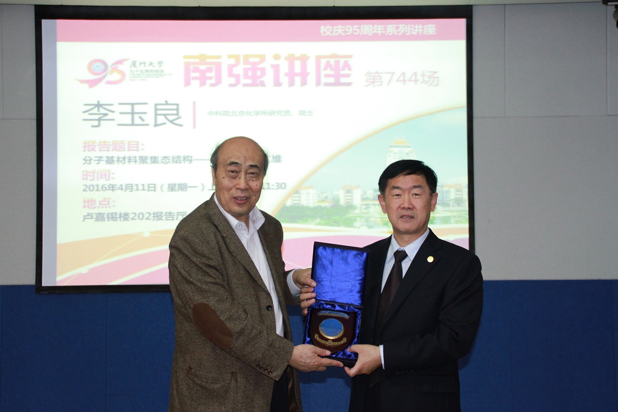 4月11日上午,为献礼厦门大学95周年校庆,李玉良院士应邀为广大师生带来了厦门大学最高层次学术讲座——南强学术讲座(第744场),讲座题目为“分子材料聚集态结构:从一维到二维”。厦门大学校长助理滕伯刚教授为李玉良院士授予了“南强讲座”荣誉纪念牌。