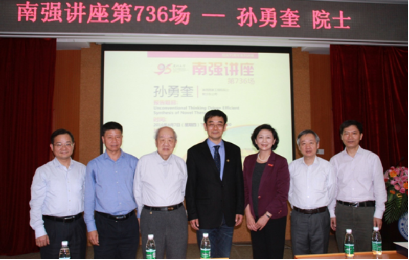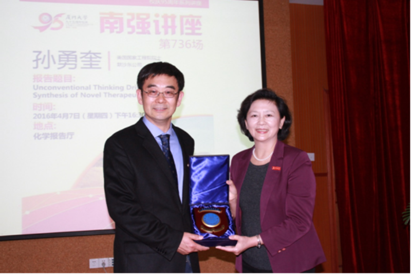 4月7日下午,厦门大学化学化工学院77级校友、厦门大学美洲校友会董事、美国国家工程院院士孙勇奎博士做客南强学术讲座,在化学报告厅为我校师生奉献一场题为“Unconventional Thinking Driven Efficient Synthesis of Novel Therapeutics”的高质量学术报告。中国科学院院士、化学化工学院教授孙世刚教授主持讲座,校友总会詹心丽副校长向孙勇奎博士赠送“南强学术讲座纪念牌”。