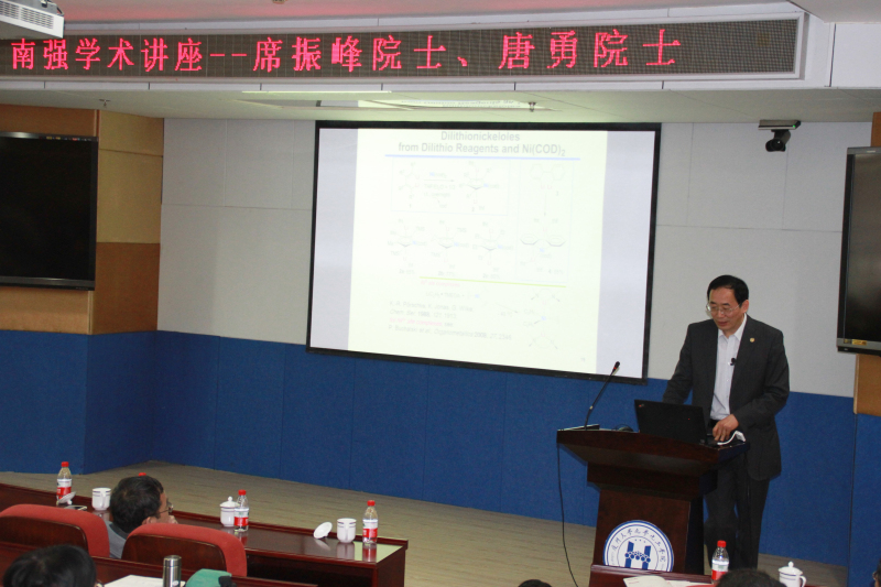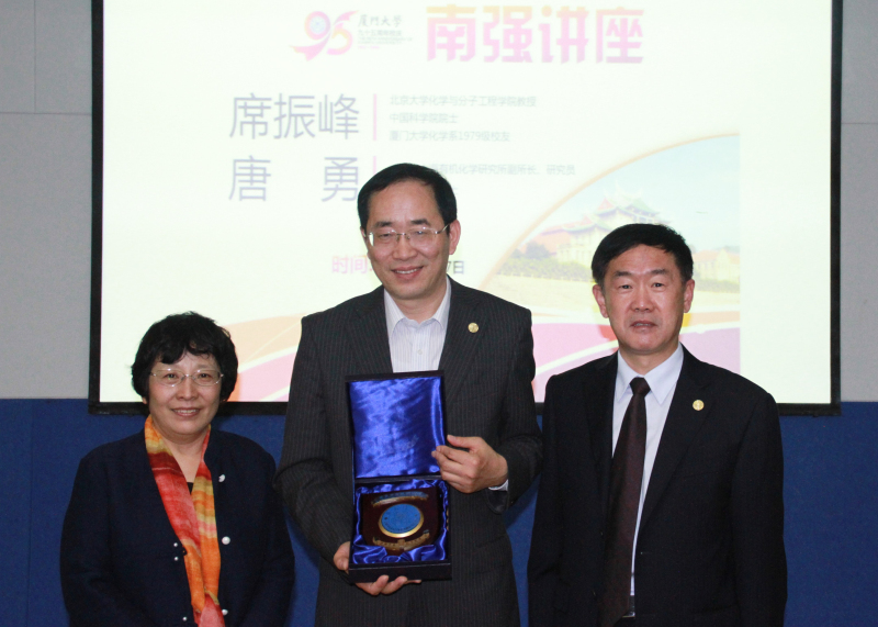 为献礼95周年校庆, 4月7日上午,1979级化学系院友、北京大学教授、中国科学院席振峰院士回访母院,应邀带来厦门大学最高层次学术讲座——南强学术讲座(第730期),题目为“双金属有机合成试剂化学”。化学化工学院院长江云宝教授主持讲座,中科院院士赵玉芬教授,校长助理滕伯刚教授,为席振峰院士授予“南强讲座”荣誉纪念牌。