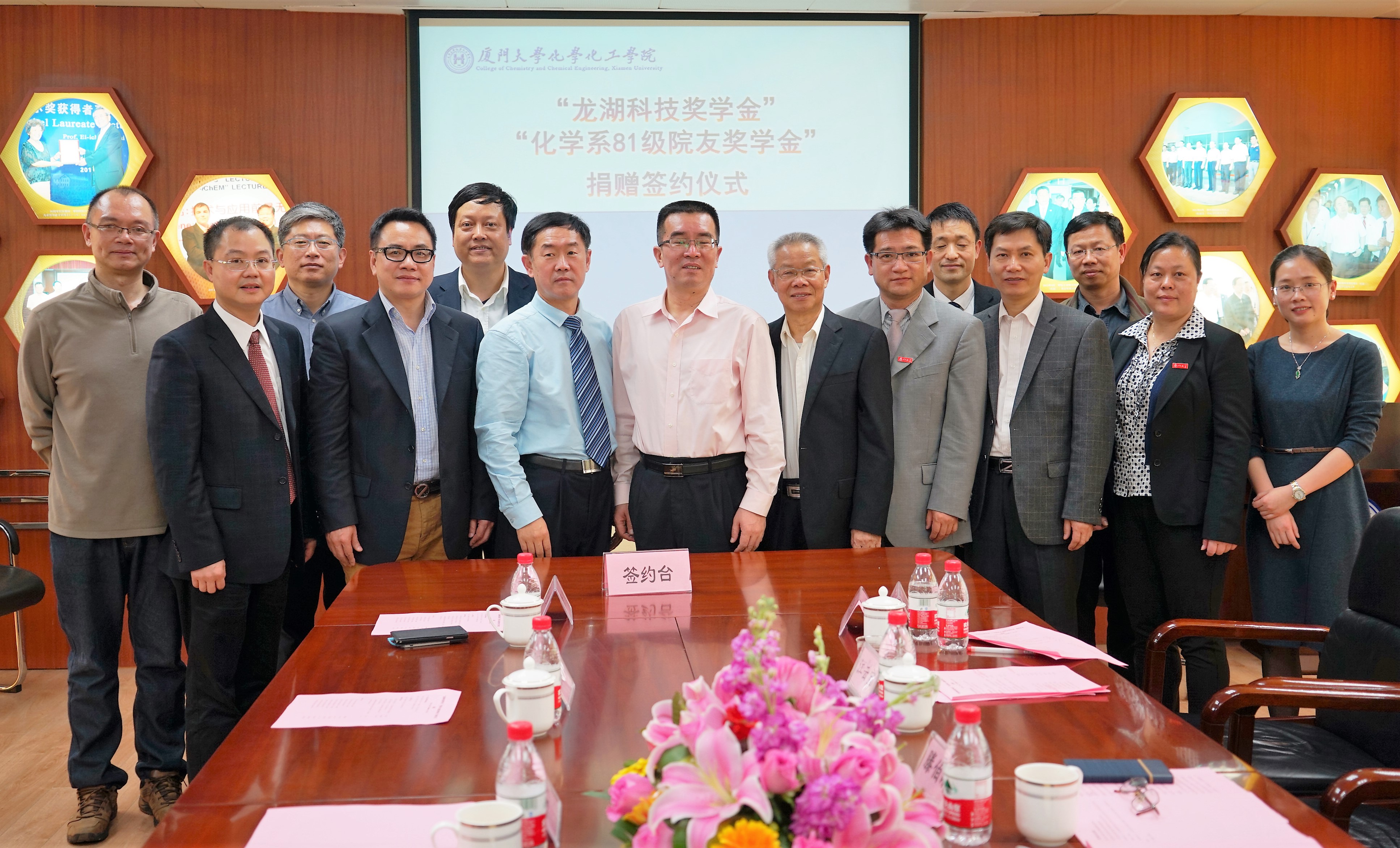 “龙湖科技奖学金”由广东龙湖科技有限公司出资30万元人民币设立永久奖励基金,每年使用基金收益与财政配套经费约2.4万元用于奖学金发放,共可使12名学生受益。该捐赠善举是校友创业打拼、事业有成后对母校、母院的深情回馈,更兼进一步拓展和深化校友企业与母院科研平台相互依存、共谋繁荣的“脐带”关系。由81级化学系广大同学集体发起,捐设“化学系81级校友奖学金”基金,共计逾50万人民币,其中更包含海外校友的厚重心意。校友奖学金拟每年使用收益等发放3万元奖学金,惠及10余名化院学子。