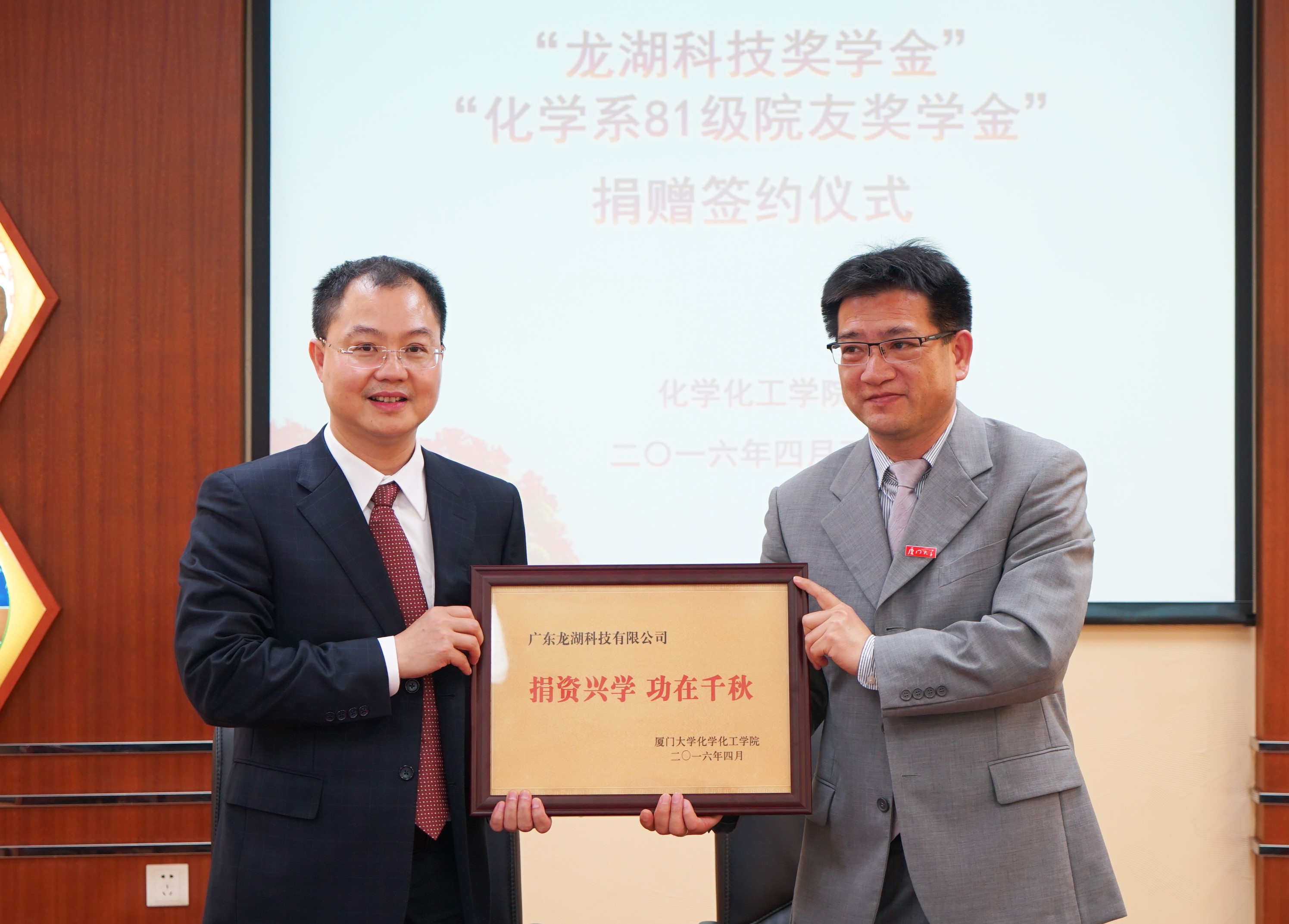 在与会嘉宾与代表的见证下,两份捐赠设奖协议完成了签署,并由江云宝院长和林辉书记分别授予广东龙湖科技有限公司、化学系81级全体校友“捐资兴学”牌匾以资纪念。
