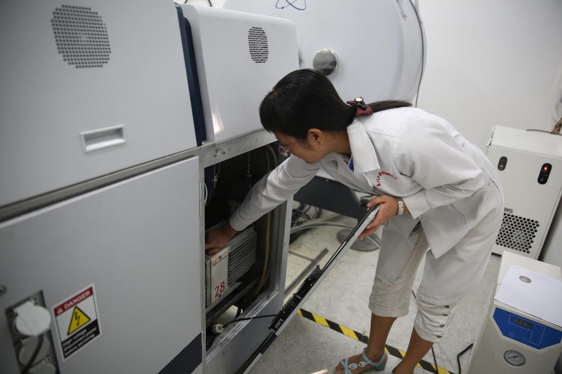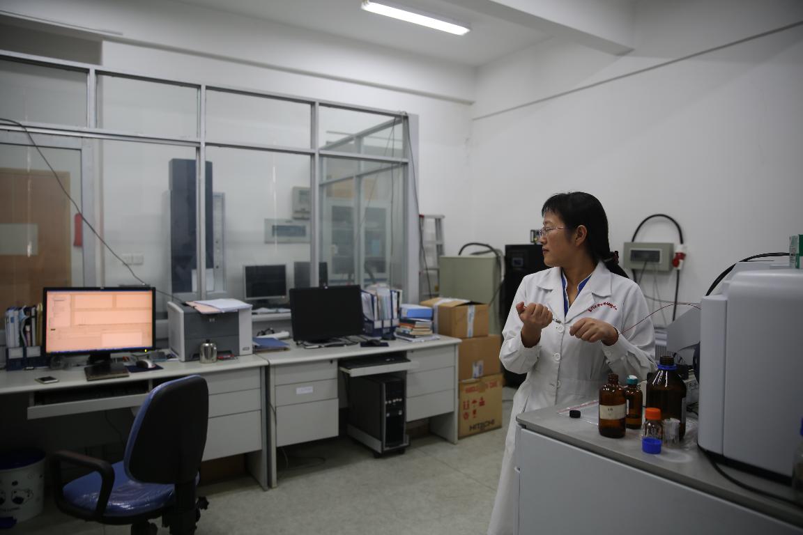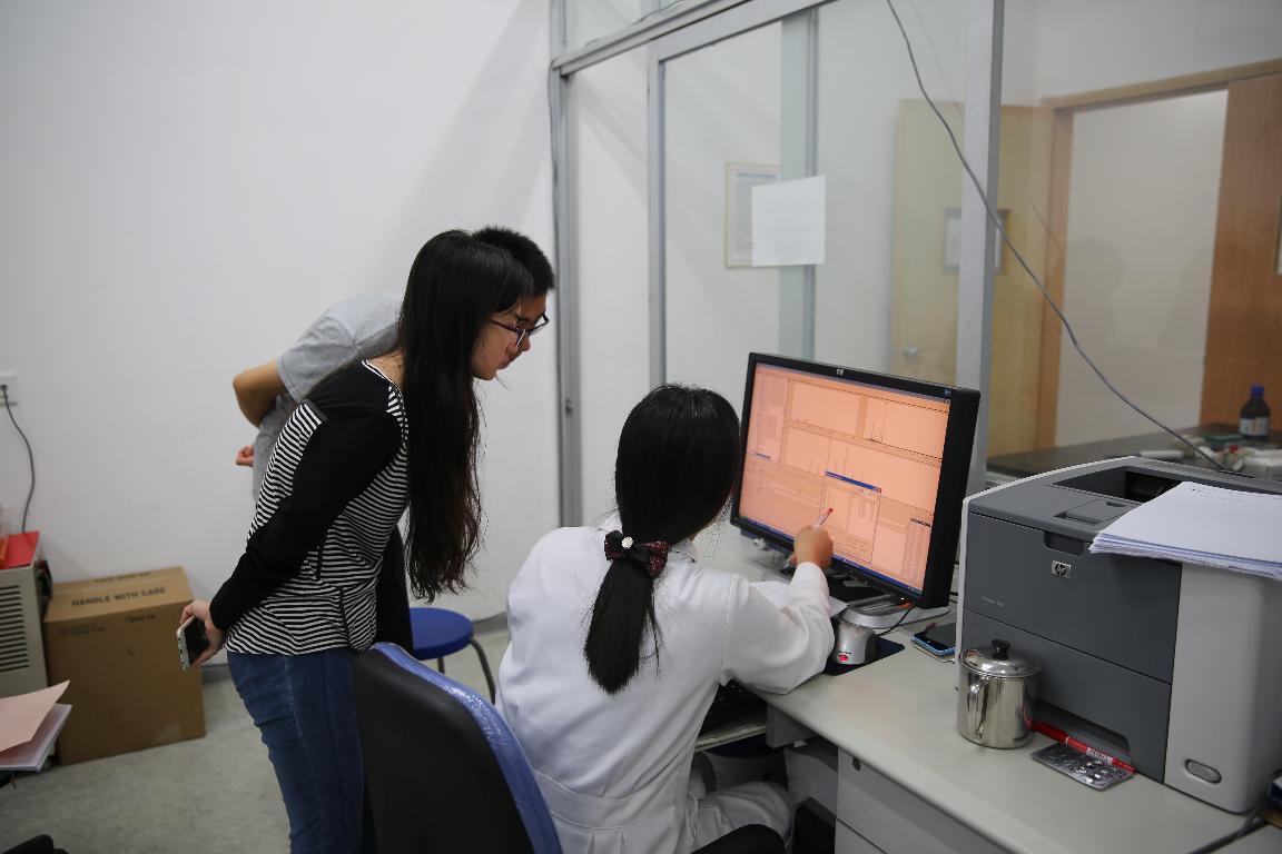 10:30,在靠门的另一台质谱仪上,2015级博士生梁晶晶正在进行样品测试。在前一天,梁晶晶参加了林老师关于仪器使用的培训,培训整整持续了三个小时。今天是她第一次独立上机操作,所以格外小心谨慎。林老师不时放下手头的活儿,提醒她需要注意的事项,还不忘不时鼓励。