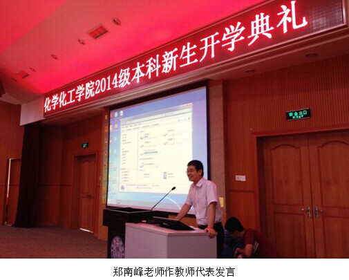 化院之强,在于雄厚的师资力量。化学系教授、郑南峰老师作为教师代表发言。笑容可掬的郑老师,没有一丝“教授”架子,反而更是一位亲切的“学长”,结合自己亲身经历,向学弟学妹们“传经送宝”。留学国外七年,年轻的郑南峰老师放弃国外优越的生活条件,认识到我院科研条件已达到国际先进水平,毅然回国为祖国科研和人才培养做出贡献。他提醒新同学们,大学四年要学什么、如何学,是最重要的命题,而答案就是:学习发展综合能力,而非仅仅是专业知识;学习态度要端正,“捷径一定是量身定做的”,达到成功没有踏实的态度、细节的追求,是不可能实现的。最后,他建议新同学,一要碰到困难多与老师同学交流,二要多锻炼身体,才能做好科研。郑老师发自肺腑的一席话赢得了全场热烈掌声。