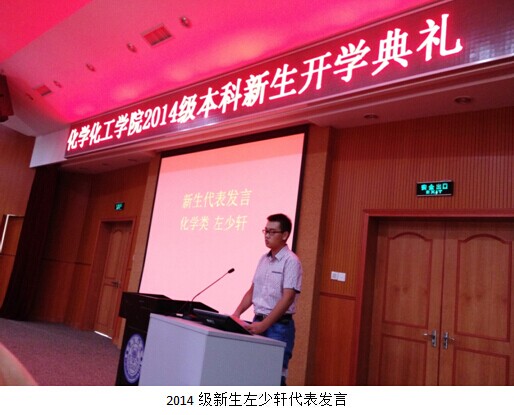 凤凰花开争斗艳,朝气蓬勃耀新生。8月26日上午9时,走过九十多年风雨的化学化工学院,今日迎来240名本科新同学,于化学报告厅济济一堂,隆重举行2014年本科新生开学典礼。江云宝院长,院党委林辉书记,关工委老师安丽思、潘宝柱,院党委李芬芬副书记,化学系系主任吕鑫,化生系系主任颜晓梅,化工系副系主任吐松,化学学科教师代表郑南峰,化工学科教师代表方柏山等院系领导老师均到会,同时出席本次典礼的,还有各系其他领导、教学秘书、新生班主任、团委书记、副书记、全体辅导员等。典礼由党委副书记刘俊杰主持。