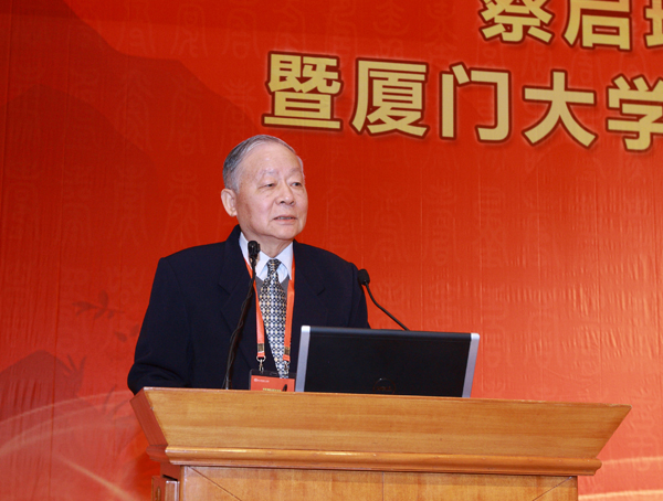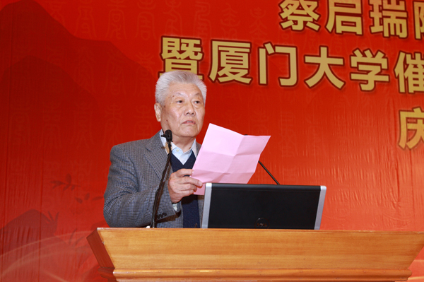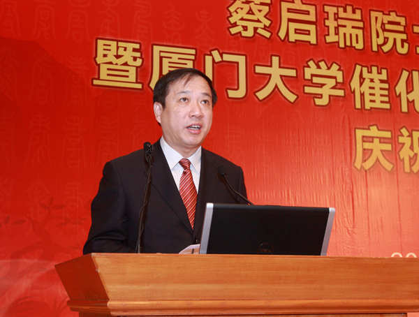 我校化学化工学院院长江云宝代表学院讲话。他说,厦门大学固体表面物理化学国家重点实验室和醇醚酯化工清洁生产国家工程实验室的先后建立,表明蔡启瑞院士不仅是基础化学实验的研究者,还是“科技是第一生产力”的践行者。无论从学术研究还是教书育人,蔡院士都是师生们的楷模,他形象诠释了厦门大学“自强不息、止于至善”的校训。我们为他骄傲,为他自豪。