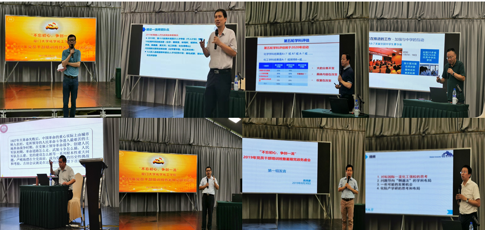 学院党委副书记、院长谢兆雄教授作动员讲话。他提出以“中国特色、世界一流”为目标,从“一流党建思政、一流支撑体系、一流人才培养、一流师资队伍、一流科学研究、一流平台建设、一流交流合作”等方面高标准严要求推进学院整体建设。讲话中谢院长回顾了新一届班子上任来学院各类会议议题落实情况,强调学院应集中力量办大事,并部署了下一阶段工作重点,希望与会干部们为化院 “这家百年老店”、 “这艘动力强劲的大船“、 “这鼎人才培养和成长的熔炉”贡献智慧力量,不忘初心、争创一流!学院副院长吕鑫教授、任斌教授和化工系主任洪文晶教授围绕教学工作、学科评估、化工系发展等做了专题报告。