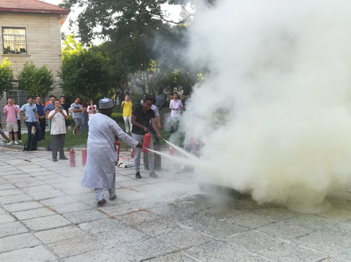 讲座结束后,国际研究生新生来到化学报告厅前的小广场,与学院的博士后和新进教师一起,在工作人员指导下进行消防安全演习。演习模拟真实火灾现场,首先由物业有关人员演示灭火器使用方法,在工作人员娴熟的操作下,明火很快被扑灭,同学们报以热烈的掌声。随后,工作人员对灭火毯和消防枪的使用也进行了详细的介绍,同学们在认真聆听的同时,也积极参与消防互动体验。国际研究生新生使用灭火器和灭火毯,操作准确,迅速地扑灭了火焰,赢得了一片掌声。