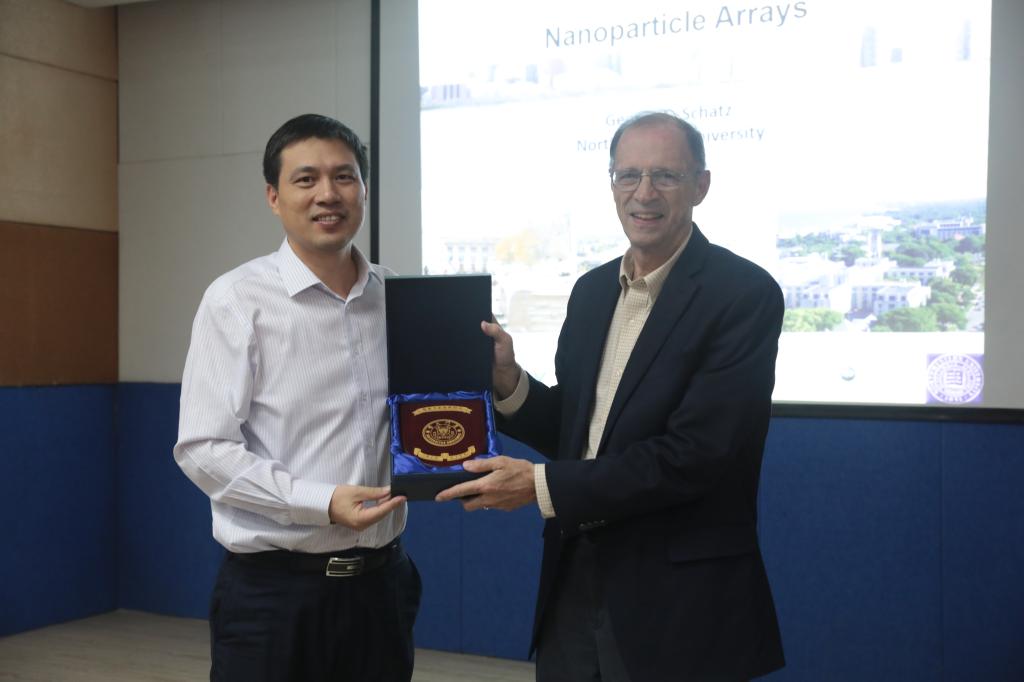11月11日上午,厦门大学第999期南强学术讲座在化学报告厅举行。美国科学院院士,Journal of Physical Chemistry杂志主编,美国西北大学化学系George C. Schatz教授应邀访问厦门大学,为师生带来一场题为“Nanoparticle Arrays”的精彩报告,李剑锋教授主持了本场南强学术讲座,讲座开始前,谢兆雄院长向George C. Schatz教授颁发了南强讲座纪念牌并合影留念。