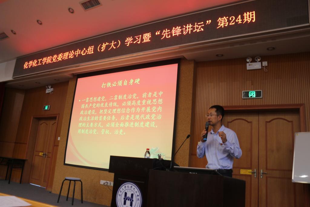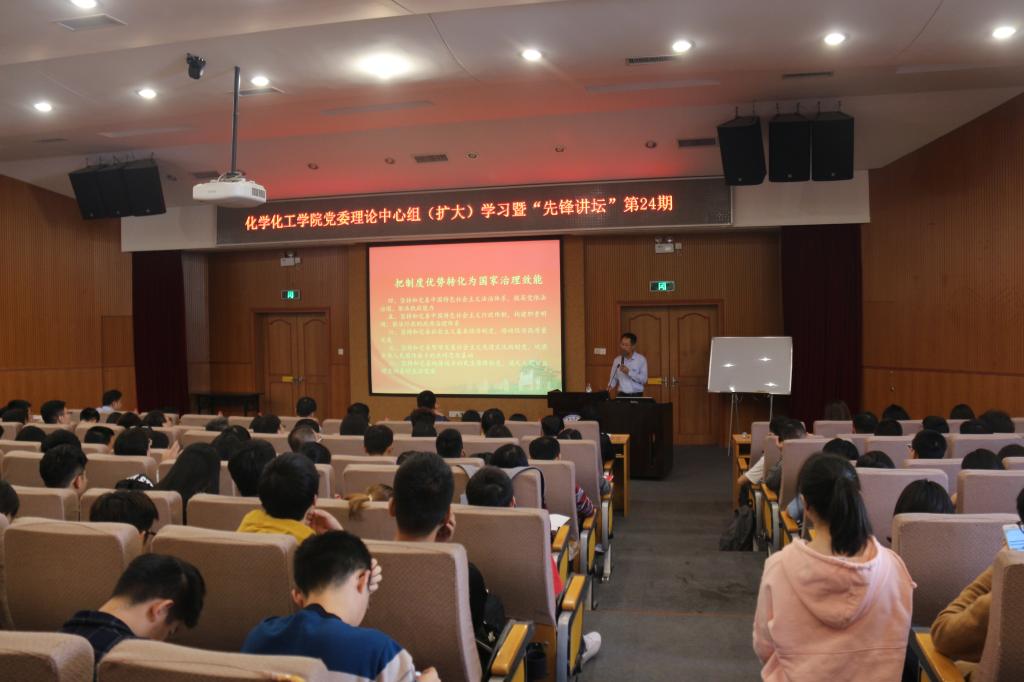 11月15日下午,为深入学习贯彻十九届四中全会精神,化学化工学院认真开展“不忘初心、牢记使命”主题教育,举办学院党委理论学习中心组(扩大)学习暨“先锋讲坛”第24期讲座,邀请了马克思主义学院张艳涛教授为我院师生作题为“把制度优势转化为国家治理效能——十九届四中全会精神解读”专题辅导报告。学院党委理论学习中心组、党政领导、师生党支部书记、党员300多人参加。报告由学院党委副书记李芬芬主持。