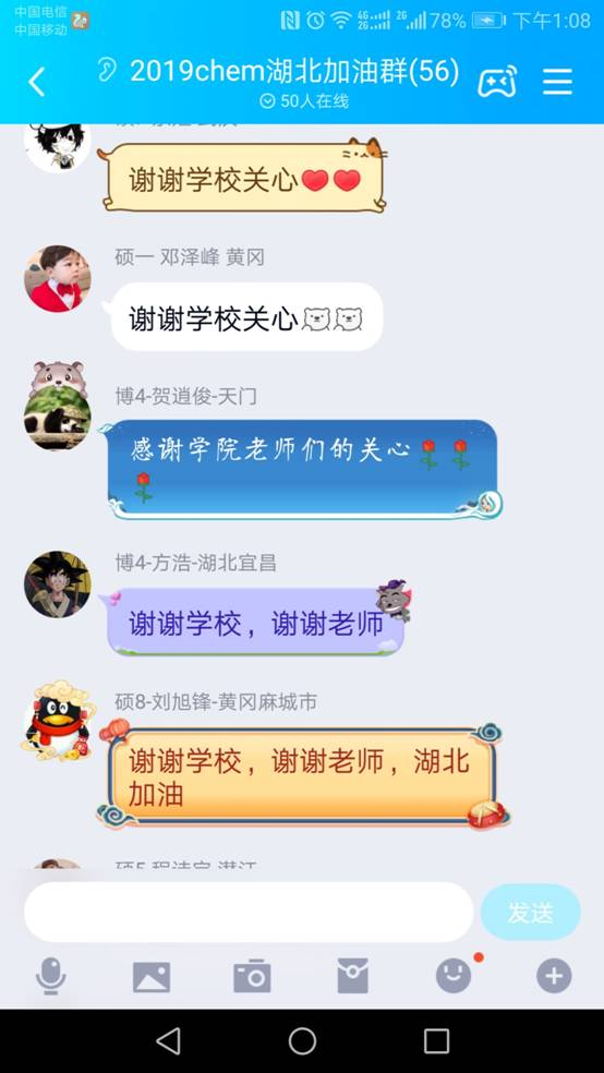 (图:工作组为留校同学发放温度计和口罩) (图:2019Chem湖北加油群学生留言)