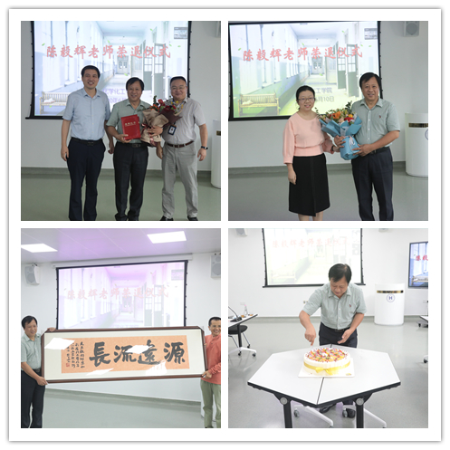 随后,学院向陈老师颁发荣誉证书,并献上鲜花与蛋糕。陈老师的同事与学生代表也送上鲜花与祝福。1988级化学系校友吕聪满代表陈老师唯一任职班主任的1988级化学系5班全体同学向陈老师赠送牌匾,上书“源远流长”,感谢陈老师的教诲与帮助,并祝陈老师健康长寿。
