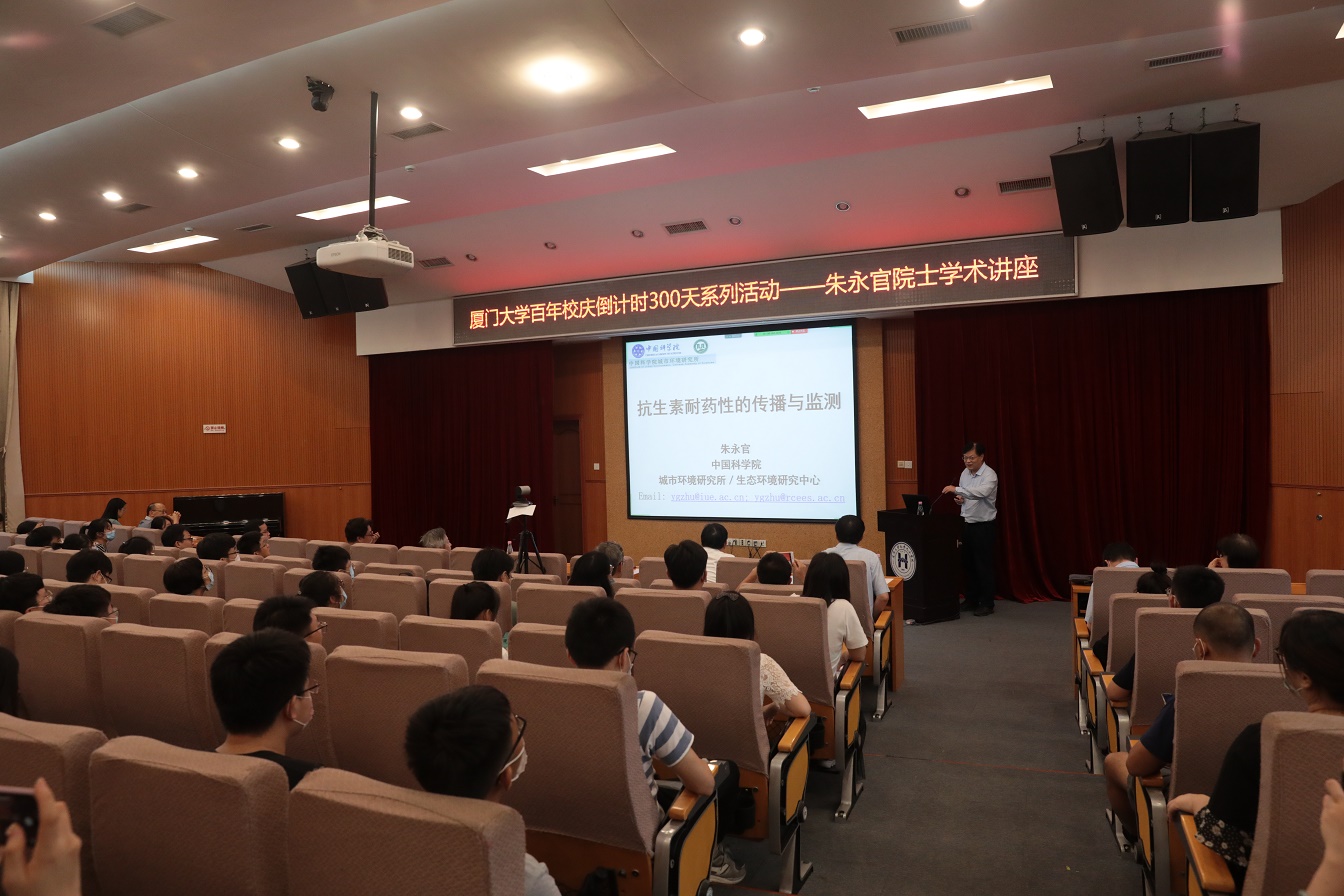 百年南强木铎传,止于至善谱新篇。6月10日下午,适逢厦门大学100周年校庆倒计时300天,中国科学院院士、中国科学院城市环境研究所朱永官研究员应邀做客我校最高层次学术讲座——“南强学术讲座”(第1022期),在化学报告厅为师生带来一场题为“抗生素耐药性的传播与监测”的精彩报告。讲座由谢兆雄院长主持,田中群院士和校科技处处长谭忠教授为朱永官院士授予“南强学术讲座”纪念牌。来自我院以及中科院城市环境研究所等近200位师生到场聆听朱院士报告,同时本次讲座通过网络进行线上直播,逾300位观众在线观看朱院士报告。
