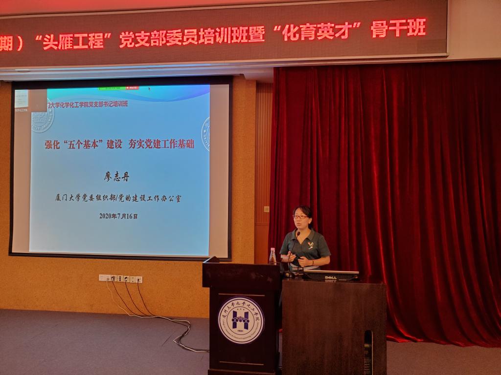 简短的开班式后,校党委党建办主任廖志丹以《强化“五个基本”建设 夯实党建工作基础》为题,展开培训班的第一堂理论学习讲座。讲座深入浅出,既严肃有活泼,指导党支部书记如何夯实党建工作。一是强化基本组织建设,此所谓“欲筑室者,先治其基”。通过严密的组织体系、严明的组织纪律、严格的组织制度提升党的组织力。二是强化基本制度建设,正是“没有规矩,不成方圆”。必须以习近平新时代中国特色社会主义思想这一富有实践伟力的强大思想武器严肃制度建设,开展新时代高校党建示范创建、质量创优工作。三是强化基本队伍建设,即为“头雁先飞,群雁齐追”。以厦门大学“扬才计划”为典型案例加强学生党支部建设,实施“头雁”工程,着力提高学生党支部书记的政治素质和业务能力,增强新时代学生党支部工作实效。四是强化基本活动建设,实为“非知之艰,行之惟艰”。严格开展党支部的组织生活,落实“三会一课”制度,积极开展主题党日活动,通过形式多样、内容丰富的党支部立项活动,加强党支部的规范化标准化建设。同时契合高校基层党组织常态化疫情防控期间的“四个一”行动,让党旗始终高高飘扬。五是强化基本保障建设,引证“兵马未动,粮草先行”。优质党建工作的开展离不开充分的经费支持和合理的平台建设。