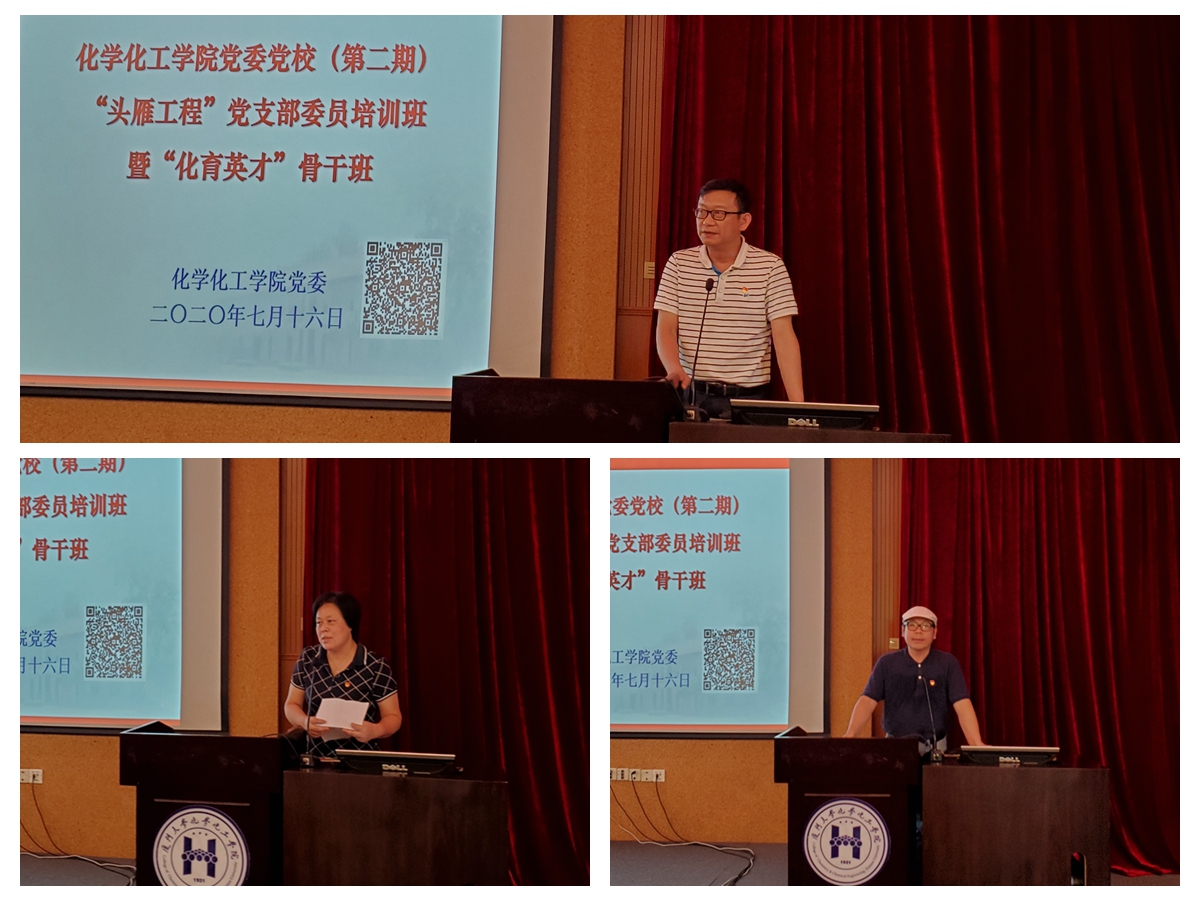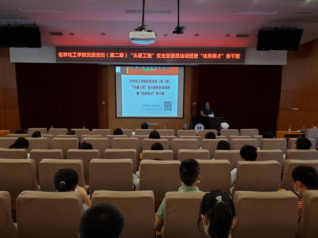 7月16日下午,化学化工学院党委党校(第二期)“头雁工程”之党支部委员培训班暨“化育英才”骨干班开班仪式在化学报告厅隆重举行。我校基层党建工作联络员白锡能,组织部副部长、校党建办主任廖志丹,学院党委书记宋毅,副书记李芬芬、刘俊杰出席,党委组织员林秀娟、全体辅导员及部分教师党支部委员、全体学生党支部委员参加了开班。仪式由院党委副书记李芬芬主持。