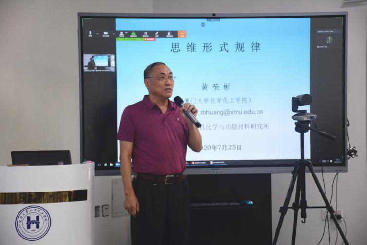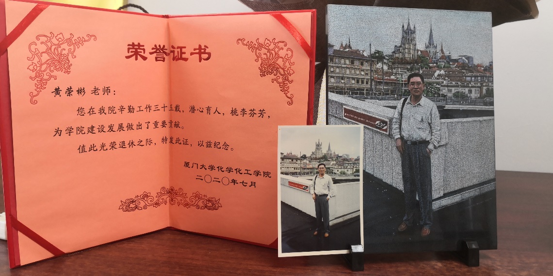 传承优秀传统,奋发开拓创新,历来被视作厦门大学化学化工学院各项事业进步的强劲动力。7月25日,在厦园明媚的阳光中,为弘扬尊师重教优良传统,展现学院教职工“传帮带”传统的良好风貌、增强学院教师的职业荣誉感,学院特别为黄荣彬教授精心组织了简短而温馨的荣退仪式,学院领导,无机化学与功能材料研究所全体成员,以及山东大学孙頔教授,华侨大学魏展画教授、骆耿耿副教授等黄荣彬教授的学生、亲朋等出席仪式,部分因疫情无法前来现场的嘉宾,也通过在线方式参加仪式,线上线下共计200余人,共同为黄荣彬教授光荣退休献上祝福。