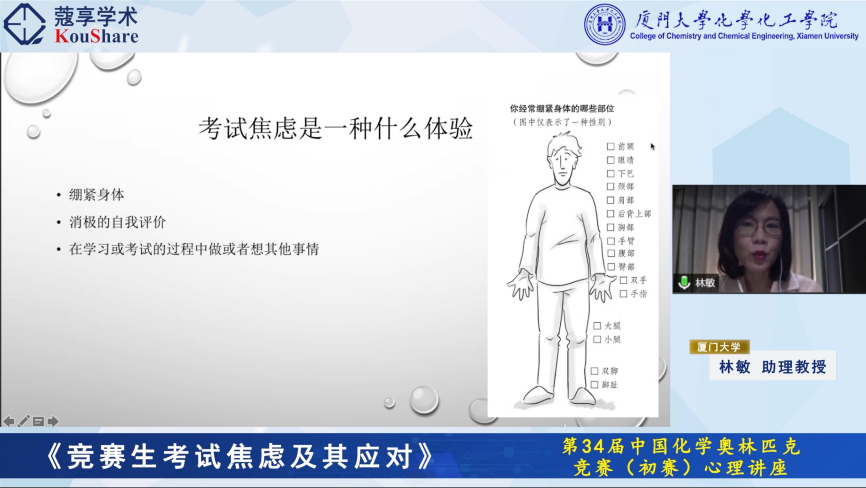最后,针对考生及家长的焦虑,厦门大学教育研究院教育心理研究所助理教授、国家二级心理咨询师、化学拔尖计划心理顾问林敏博士做专业讲座进行指导。应大家强烈要求,次日下午再次为考生和家长开设题为“竞赛生考试焦虑及其应对”的专场线上讲座,累计超过3000人次在线观看了直播。