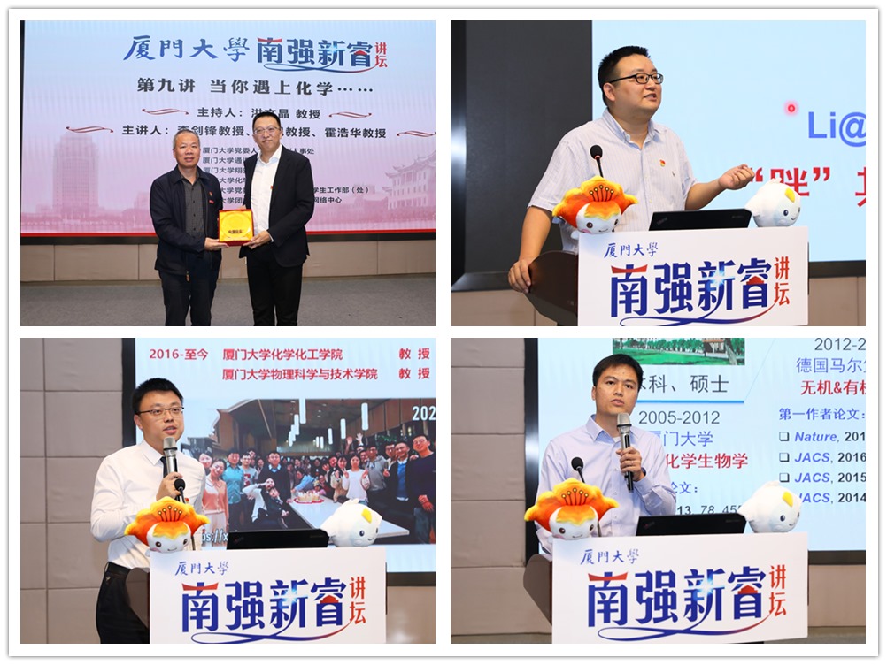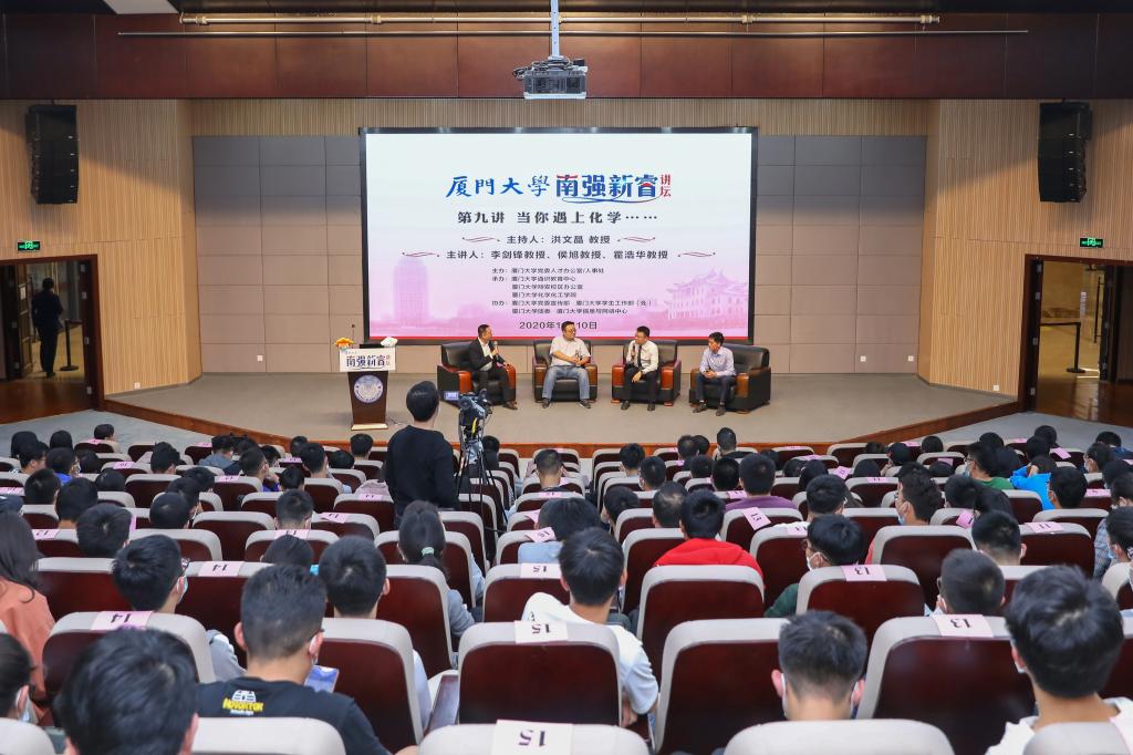 11月10日晚,厦门大学南强新睿讲坛第九讲“当你遇上化学”专题讲座在翔安校区德旺图书馆2号报告厅举行。讲座同步设置了思明校区化学报告厅分会场进行实时直播。化学化工学院李剑锋、侯旭、霍浩华三名青年教授共同为学校师生带来“当你遇上化学”专题讲座。校长助理张建霖教授出席讲坛,人事处处长、党委人才工作办公室副主任李军教授、通识教育中心常务副主任朱菁教授、化学化工学院党委书记宋毅等主办、承办、协办单位负责人出席本次讲坛。