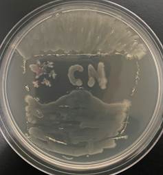 (平板作画一等奖作品——抗疫医生:作者以大肠杆菌为画笔在牛肉膏蛋白胨培养基上勾勒出生动的抗疫医生形象,戴着防护帽和口罩,护目镜上清晰地映衬出五星红旗)