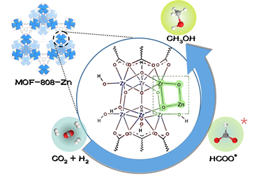 负载型金属催化剂在催化CO2加氢反应中已经得到了广泛研究。其中,Zr-Zn催化剂因具有选择性高、成本低廉等优势一直是人们研究的热点,然而这类加氢催化剂活性位点的精确结构至今尚未明确。汪骋课题组以Zr基金属有机框架MOF-808为平台,通过金属后修饰成功构建具有双功能催化中心的MOF-808-Zn,发现该催化剂在CO2加氢反应中展现出优异的催化活性以及高的甲醇选择性,进而对其构效关系进行了细致的表征和分析。X射线吸收光谱(XAS)和电子密度差谱(DED)分析表明,该催化剂在CO2加氢反应中的活性位点为Zn2+-O-Zr4+中心。H2程序升温脱附实验(H2-TPD)和H/D交换实验显示,Zn2+位点是吸附和活化H2的活性位。CO2程序升温脱附实验(CO2-TPD)则表明配位不饱和的Zr4+位点对于CO2吸附的重要性。原位漫反射傅里叶变换红外光谱(in situ DRIFT)进一步揭示了反应中间体为吸附的甲酸根。MOF-808-Zn中金属氧节点明确的局部结构为阐明双功能催化中心的结构细节提供了独特的机会。